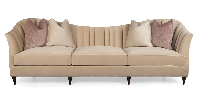 Классический мягкий диван на скрытом каркасе. Опирается на невысокие ножки. Симметричная изогнутая спинка, украшена вертикальной стежкой. Тонкие фигурные подлокотники так же в мягкой отделке.