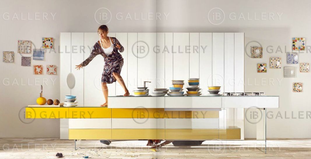 Каркас модели выполнен из массива дерева, фасад и столешница - из стекла, ящики - алюминий.