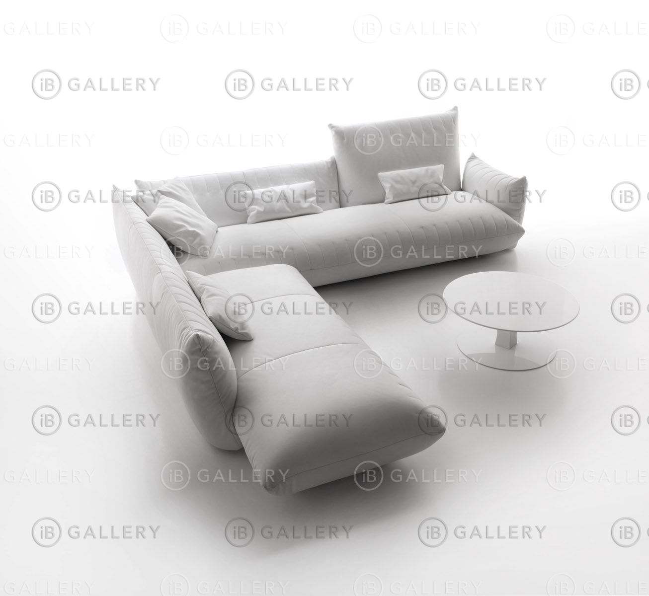 Диван отличается низким сиденьем и спинкой, состоящей из подушек разной высоты.