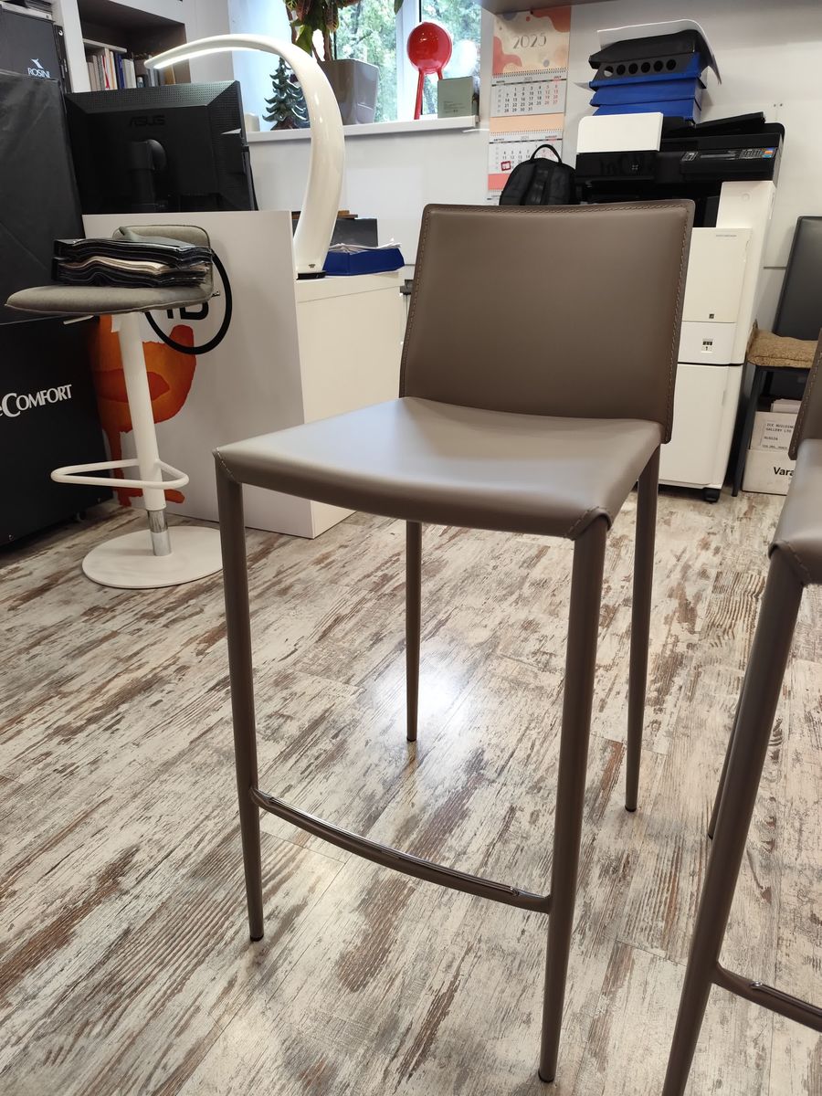 Высокий барный стул, выполненный в лаконичном дизайне. Модель представлена в отделке: P176 MATT TAUPE + D03 TAUPE TÓRTOLA металл и жесткая восстановленная кожа.