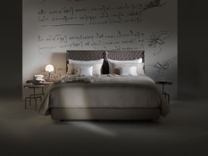 • Дизайнерская кровать в текстиле или в коже, оснащенная двумя выдвижными ящиками по бокам от изголовья