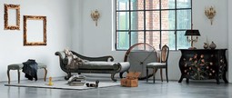 - Банкетка с изогнутыми ножками, рекамье, 2 зеркала, стул с подлокотниками и комод обтекаемой формы.